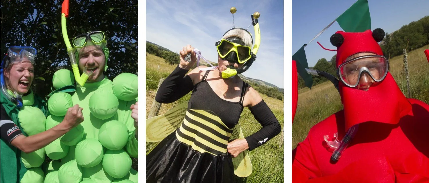 Every August Bank Holiday, the small town of Llanwrtyd Wells (just over half an hour from Coety Bach) hosts the gloriously bonkers World Bog Snorkelling Championships. It’s exactly what it sounds like: grown adults in fancy dress and snorkels flinging themselves into a water-filled peat bog and swimming two lengths with flippers, a snorkel and no front crawl allowed. Just good old-fashioned frog kicking and a lot of determination.
