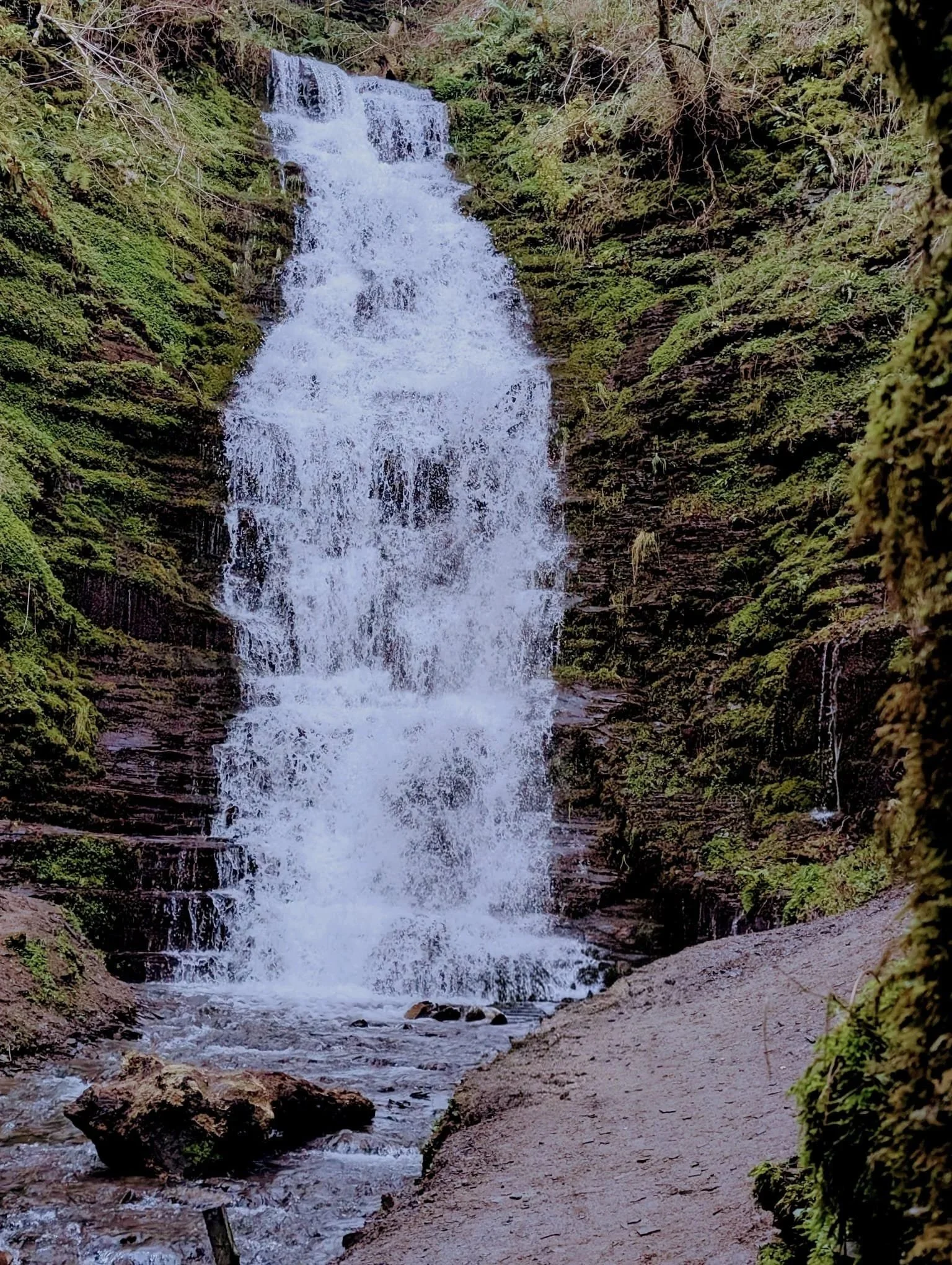 Water-break-its-neck is a sizeable waterfall in Warren Wood, part of Radnor Forest in Powys. It has a drop of around 20 to 25 metres, so it feels impressive when you are standing below it with the trees rising above you. It is an easy drive from Coety Bach, and the woodland hiking trails there are just right if you want fresh air and trees without a full-on mountain day.